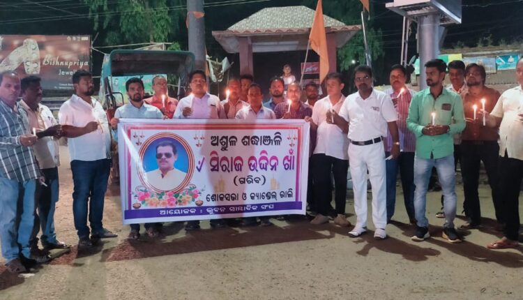 ଭୁବନ: ଭୁବନ ଅଂଚଳର ଜଣାଶୁଣା ସାମ୍ବାଦିକ ତଥା ଯୁବ ସମାଜସେବୀ ସିରାଜ ଉଦ୍ଦିନ ଖାଁ (ଗରିବ) ଙ୍କର ଗତକାଲି ସକାଳେ କଟକ ବଡ ଡାକ୍ତରଖାନା ରେ ଅକାଳ ବିୟୋଗ ହୋଇଥିଲା । ଏଥି ସକାଶେ ଭୁବନ ସାମ୍ବାଦିକ ସଂଘ ତରଫରୁ ବରିଷ୍ଠ ସାମ୍ବାଦିକ ପ୍ରେମାନନ୍ଦ ମହାନ୍ତି ଙ୍କ ଆହ୍ୱାନ କ୍ରମେ ସ୍ୱର୍ଗତ ଗରିବ ଙ୍କ ଉଦେ୍ଦଶ୍ୟରେ ଆଜି ସଂଧ୍ୟାରେ ଏକ ଶୋକସଭା ଓ କ୍ୟାଣ୍ଡେଲ ରାଲି ଅନୁଷ୍ଠିତ ହୋଇଯାଇଛି ।
