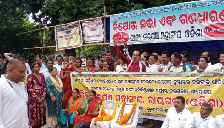 ଭୁବନେଶ୍ଵର : ସରପଞ୍ଚମାନଙ୍କ 15 ଦଫା ଦାବି ପୂରଣ ପାଇଁ ରାଜ୍ୟ ସରକାରଙ୍କ ସହ ବାରମ୍ୱାର ଆଲୋଚନା କରିବା ପରେ ଏହାର ସମାଧାନ ଦିଗରେ କୌଣସି ନିଷ୍କର୍ସ ବାହାରିପାରିନଥିଲା। ଫଳରେ ଗତ ସେପ୍ଟେମ୍ୱର 23 ତାରିଖ ଠାରୁ ପିଏମଜି ଛକ ଠାରେ ସରପଞ୍ଚମାନଙ୍କ ଚାଲିଥିବା ଧାରଣା 16 ଦିନରେ ପହଞ୍ଚିଛି । ଆଜି ଧାରଣାସ୍ଥଳକୁ ରାୟଗଡ଼ା ବିଧାୟକ ମକରନ୍ଦ ମୁଦୁଲି, ରାଷ୍ଟ୍ରୀୟ ପଞ୍ଚାୟତିରାଜ ଗ୍ରାମ ପ୍ରଧାନ/ସରପଞ୍ଚ ସଂଗଠନ ଓଡ଼ିଶା ଶାଖା ସଭାପତି ରବି ରଥ ଓ ସମ୍ପାଦକ ଡ଼ା. ରାଜାରାମ ଷଡ଼ଙ୍ଗୀ ପହଞ୍ଚି ସରପଞ୍ଚମାନଙ୍କ ନ୍ୟାର୍ଯ୍ୟ ଦାବି ପୂରଣ ନିମନ୍ତେ ସରକାର ପଦକ୍ଷେପ ନେବାକୁ ଦାବି କରିଥିଲେ । ଦାବି ପୂରଣ ହେବା ଯାଏଁ ଆନ୍ଦୋଳନ ଚାଲୁ ରହିବ ବୋଲି ଉଭୟେ ଘୋଷଣା କରିଥିଲେ ।